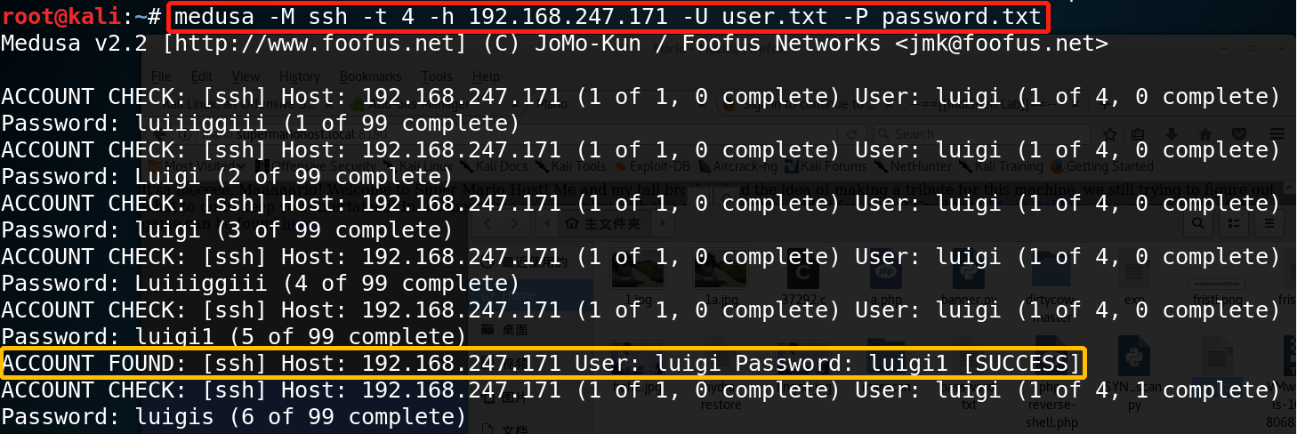 medusa -M ssh -t 4 -h 192.168.247.171 -U user.txt -P password.txt