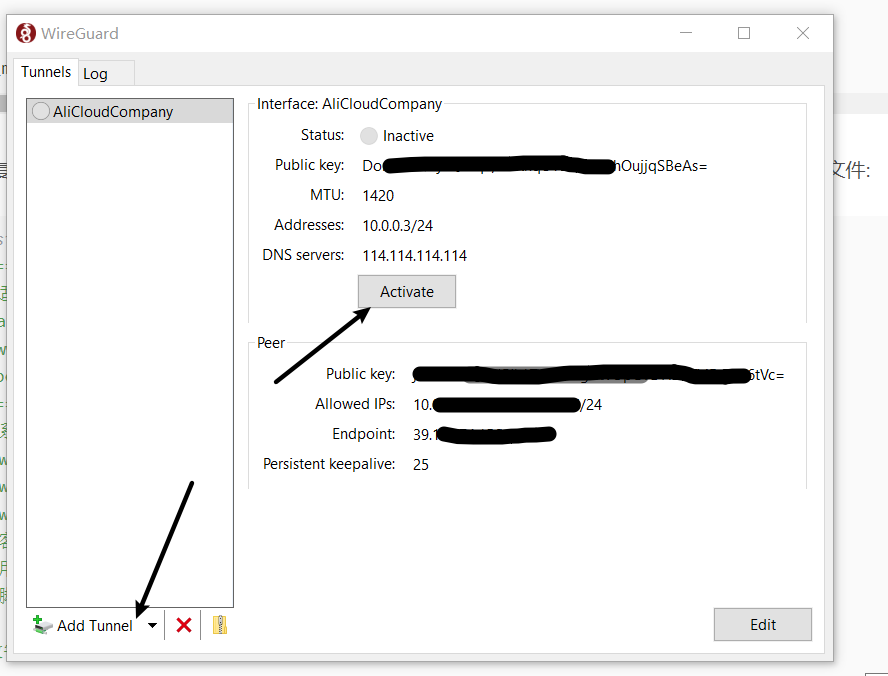 分别把home.conf文件和company.conf文件复制到家里和公司的办公电脑。家里和公司的电脑是windows系统,直接下载对应的安装包安装就可以了,跟安装普通的软件一样.安装好后打开,导入客户端配置文件再点Activate就可以了: