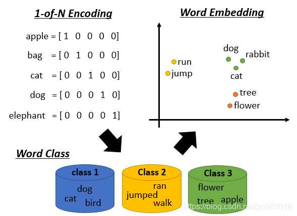 后来有了更进阶的想法,称作word embedding,我们用一个向量来表示一个单词,相近的词汇距离较近,如cat和dog。那word embedding怎么训练呢?比较熟知的就是word2vec方法。