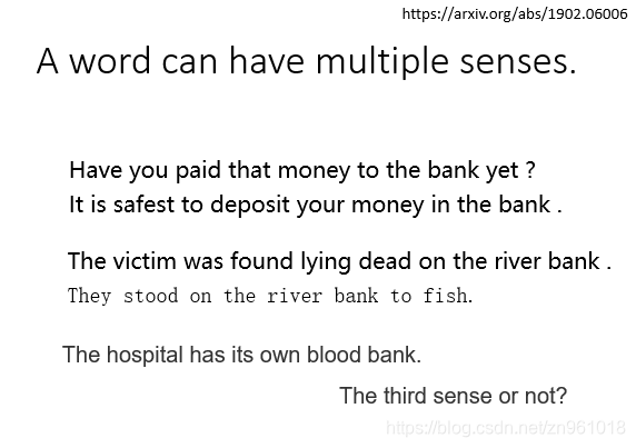 但是呢,同一个词是可能有不同的意思的,如下图中的bank,前两个指银行,后两个指河堤: