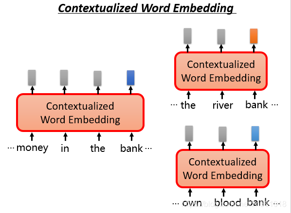 根据上下文语境的不同,同一个单词bank我们希望能够得到不同的embedding,如果bank的意思是银行,我们期望它们之间的embedding能够相近,同时能够与河堤意思的bank相距较远。