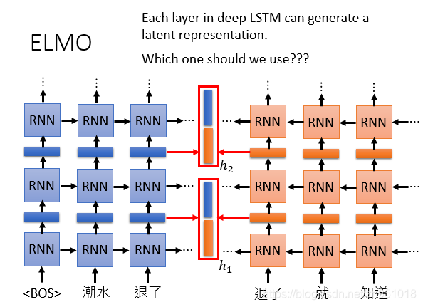 在ELMO中,一个单词会得到多个embedding,对不同的embedding进行加权求和,下图中只画了两层RNN输出的hidden state,其实输入到RNN的原始embedding也是需要的,所以你会看到说右下角的图片中,包含了三个embedding。