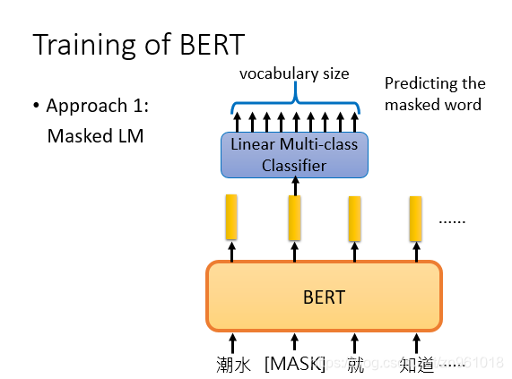 只是Transformer中的Encoder,那Bert怎么训练呢?给出了两种训练的方法,第一个称为Masked LM,做法是随机把一些单词变为Mask,让模型去猜测盖住的地方是什么单词。假设输入里面的第二个词汇是被盖住的,把其对应的embedding输入到一个多分类模型中,来预测被盖住的单词。