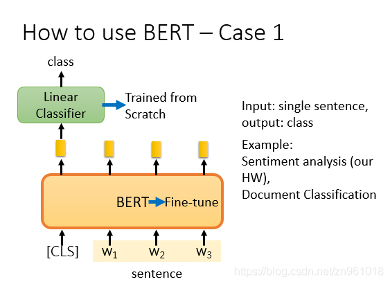 如果现在的任务是 classification,首先在输入句子的开头加一个代表分类的符号 [CLS],然后将该位置的 output,丢给 Linear Classifier,让其 predict 一个 class 即可。整个过程中 Linear Classifier 的参数是需要从头开始学习的,而 BERT 中的参数微调(fine-tuning)就可以了。