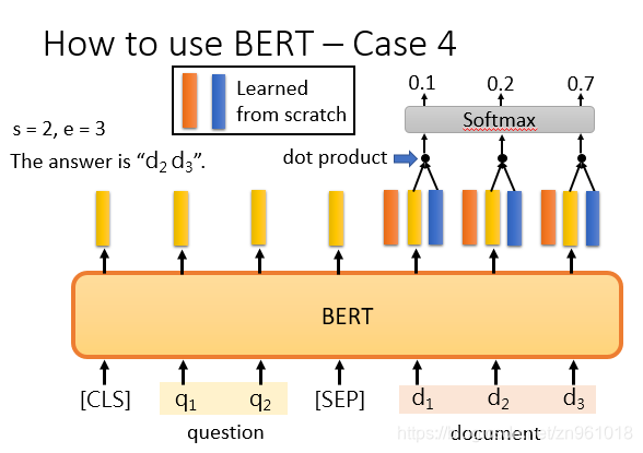 首先将问题和文章通过 [SEP] 分隔,送入 BERT 之后,得到上图中黄色的输出。此时我们还要训练两个 vector,即上图中橙色和蓝色的向量。首先将橙色和所有的黄色向量进行 dot product,然后通过 softmax,看哪一个输出的值最大,例如上图中d2对应的输出概率最大,那我们就认为 s=2。同样地,我们用蓝色的向量和所有黄色向量进行 dot product,最终预测得 d3的概率最大,因此 e=3。最终,答案就是 s=2,e=3
