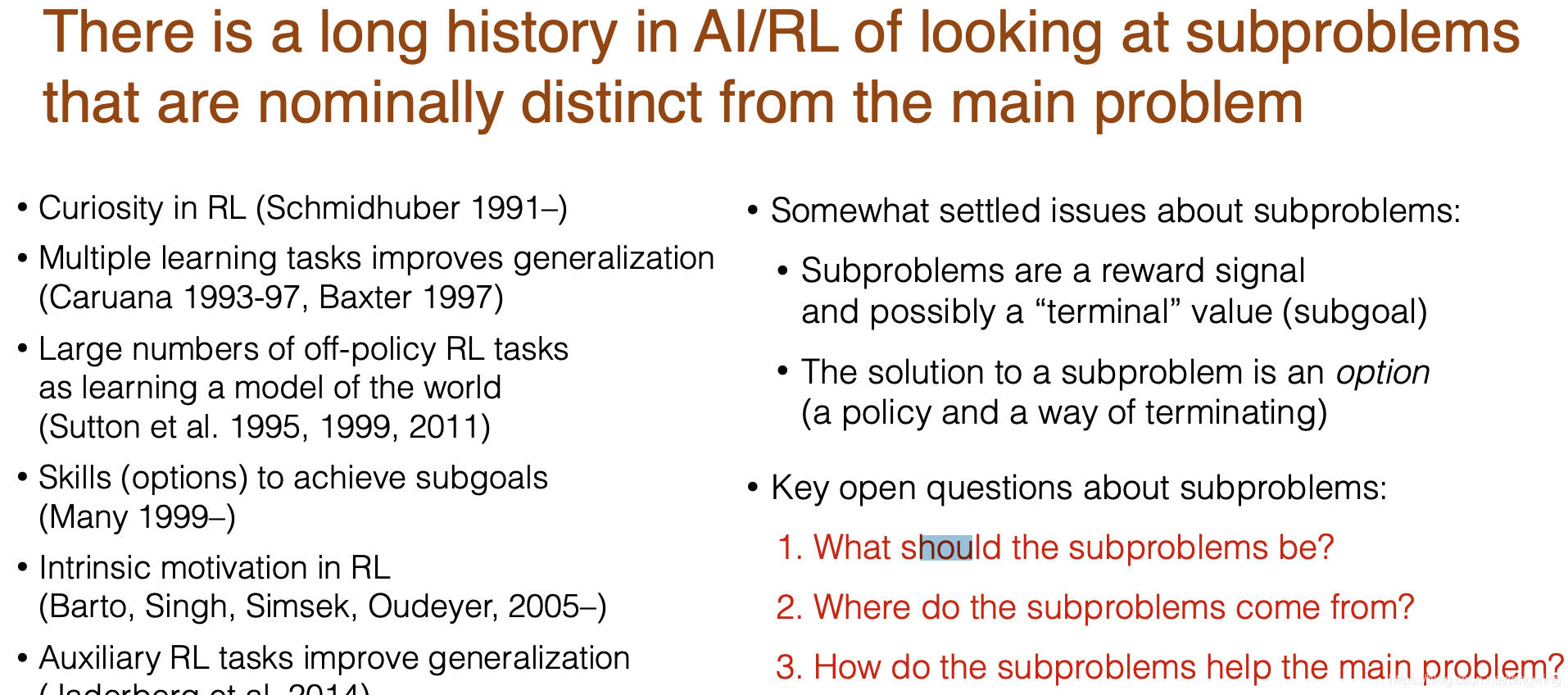 下文简而言之,Sutton is working on subprolems. The world env is often too complex to learn as a whole. It's natural to have multiple components like different parts of the body. I think it's a bit like the multi-agent concept, whose goals may not directly relate to the global reward.
