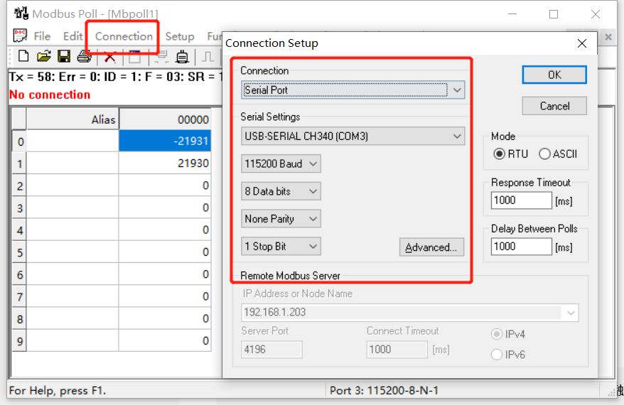 打开 modbus Poll软件 -->Connection, 在弹出的对话框Connection Setup进行波特率等设置,设置好之后点击OK.