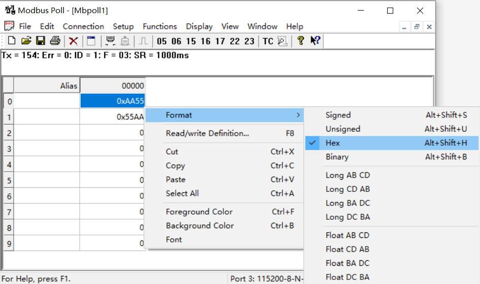 通讯数据应该为0XAA55和0X55AA,此处显示的十进制数,需要进行转换一下。将Signed的数据类型,转换成Hex,则显示数据与我们的预期一致。