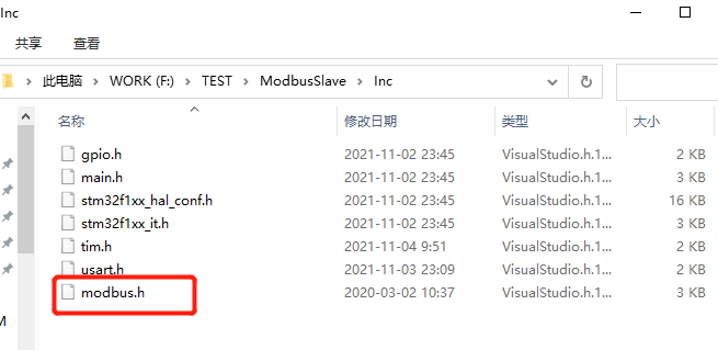 在https://download.csdn.net/download/tangxianyu/37014694地址下载modbus-slave(RTU)程序,解压后分别将已经编写好的modbus.c和modbus.h分别复制到Src和Inc文件夹内