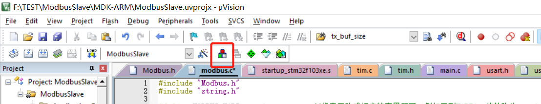 添加完成之后点击编译,此时会发现有很多错误,不用理会错误。我们可以发现modbus.h也同样显示出来了。