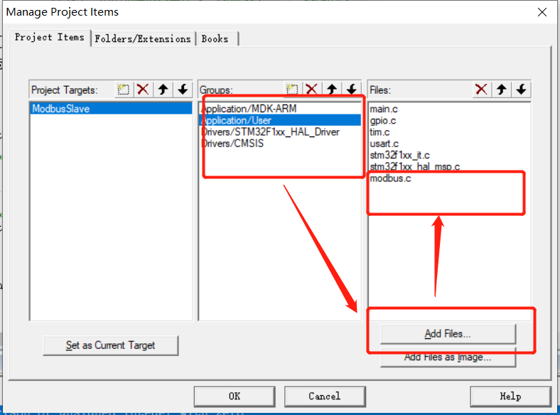 将modbus.c文件加入到工程当中,具体步骤如下图所示,不赘述。