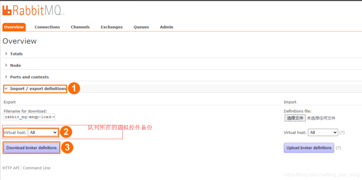删除完成后, 将导出的 虚拟空间json中 空name 的 队列删除 。 然后 在overview的最下方的 import definitions 进行导入。