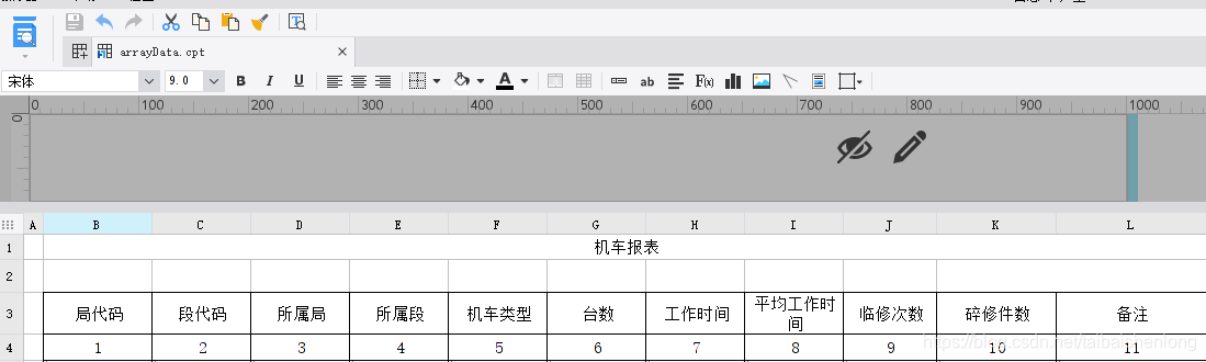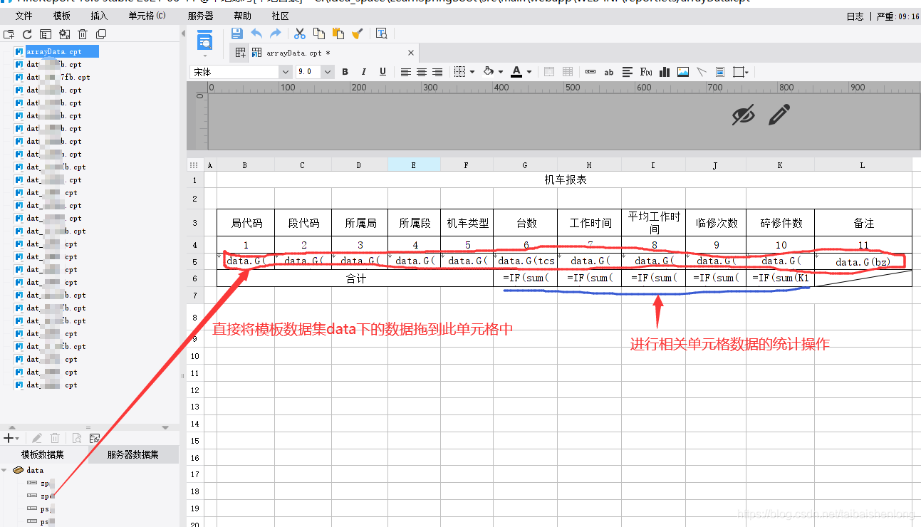 8、映射好该类后,便可以进行cpt文件的数据编辑操作以及统计操作,直接将模板数据集中的内容拖到单元格中,统计内容如如台数,输入=号,然后定义公式,如:IF(sum(G10) > 0, SUM(G10), '')