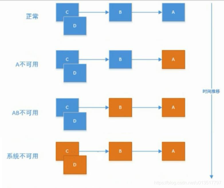 A作为服务提供者,B为A的服务消费者,C和D是B的服务消费者。A不可用引起了B的不可用,并将不可用像雪球一样放大到C和D时,雪崩效应就形成了。