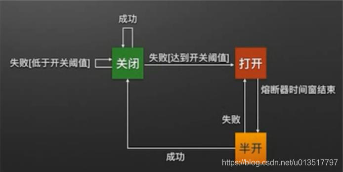 正常情况下,断路器是关闭的;当请求服务出现异常时,断路器打开,请求该服务时,立即返回错误;当断路器设置的时间窗结束,就会进行请求分流,一部分依然直接返回错误,一部分尝试去重新请求服务,此时为半开状态,当检测到服务的请求通过率正常时(低于开关阈值),就会将断路器半开闭状态修改为关闭状态;当检测到服务的请求通过率依然不行,依然会将断路器全部打开。