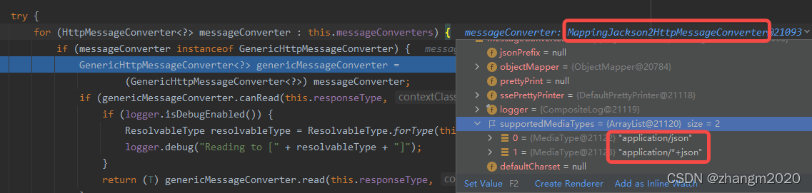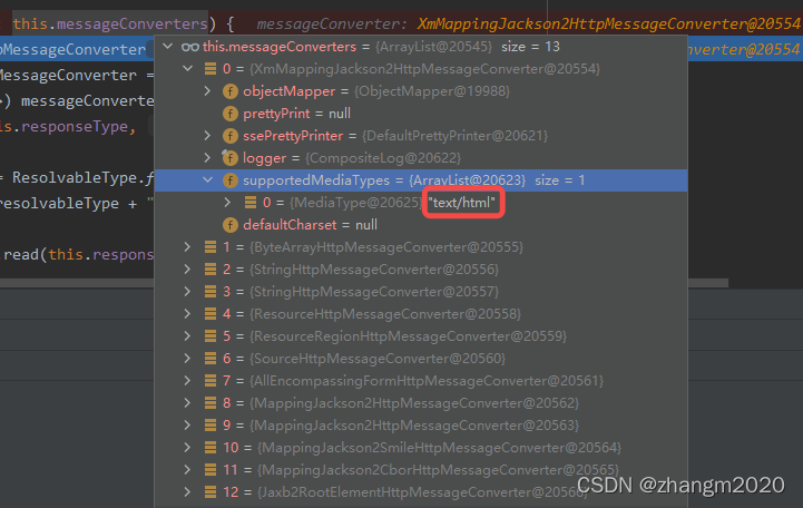 继续往下走,通用的http消息转换器匹配到自己的子类MappingJackson2HttpMessageConverter,但是可以看到的是supportedMediaTypes 只支持:application/json 的 MediaType。并不能转换text/html