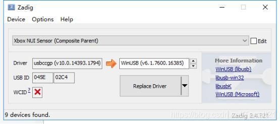 骚操作:下载zadig ,启动-选中kinectV2 xbox 传感器的USB驱动 刷新libusb驱动。(妈的,幸好当初各种截图,各种留底,不然都不知道咋办)。