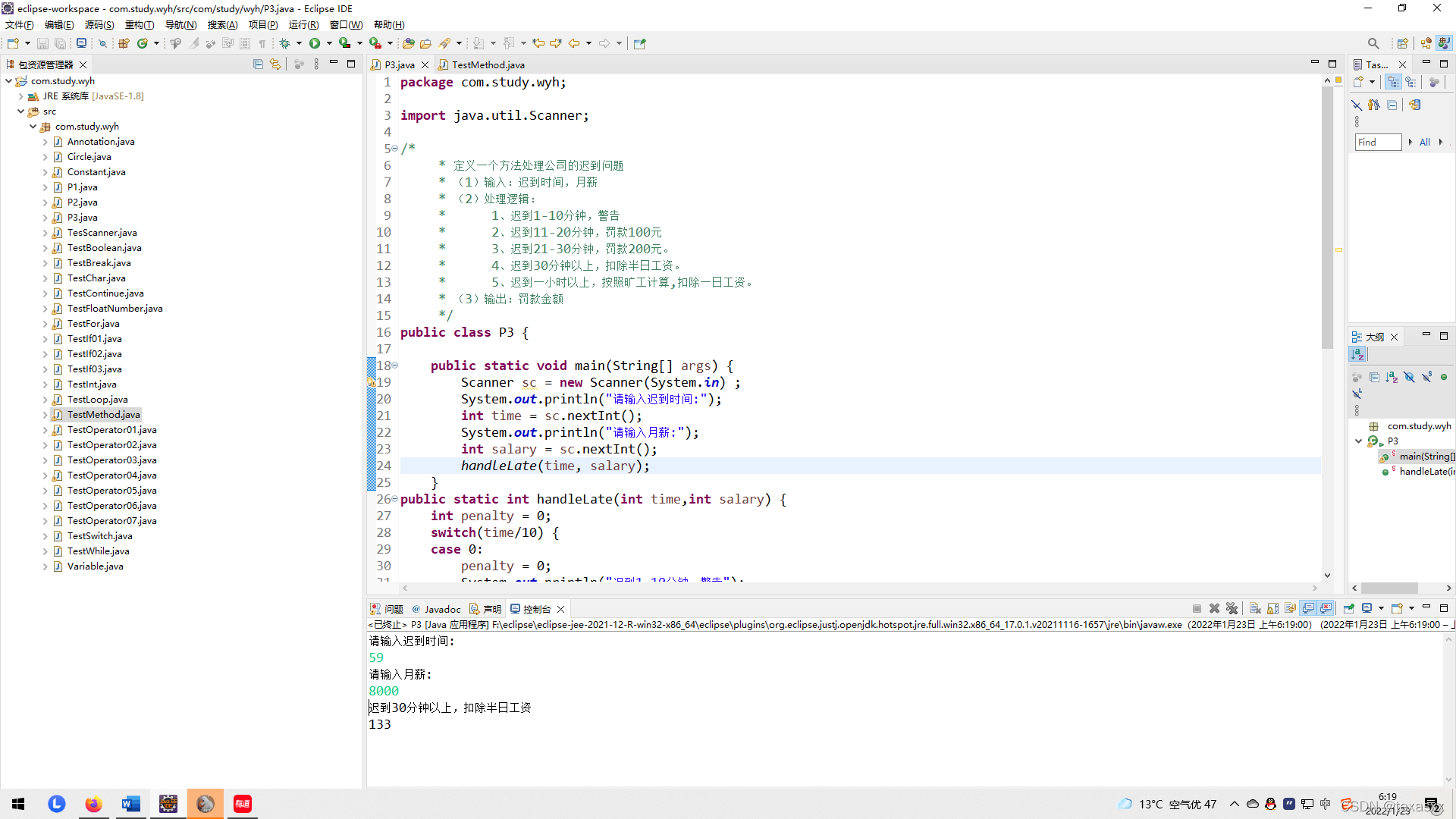 public class P3 {public static void main(String[] args) {Scanner sc = new Scanner(System.in) ;System.out.println("请输入迟到时间:");int time = sc.nextInt();System.out.println("请输入月薪:");int salary = sc.nextInt();handleLate(time, salary);}
