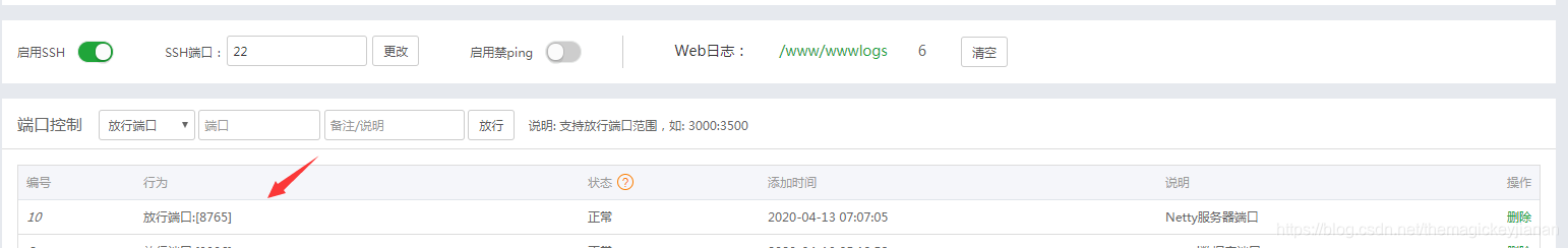 5)用宝塔放行8765端口让外网客户端可以连接上