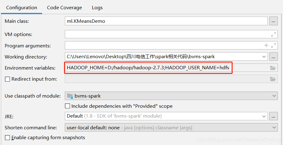2. 配置运行时的环境变量,一个是指定windows上面的hadoop目录,另外一个是指定hadoop用户的名字(建议是采用集群里可操作hdfs的最大权限的用户名)。