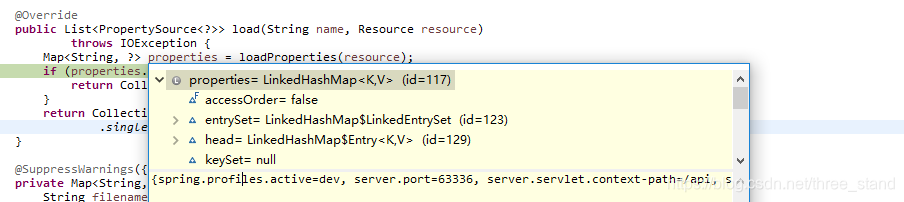 循环加载器获取文件,注意在加载EnvironmentPostProcessor实现类是有顺序的,也就是说后面的属性会覆盖前面文件的属性,还记得postProcessors.add(this)么,也就是说最后才会加载ConfigFileApplicationListener,将本项目中的配置文件替换前面配置文件的属性,然后在看下本项目的加载依次的顺序如下:
