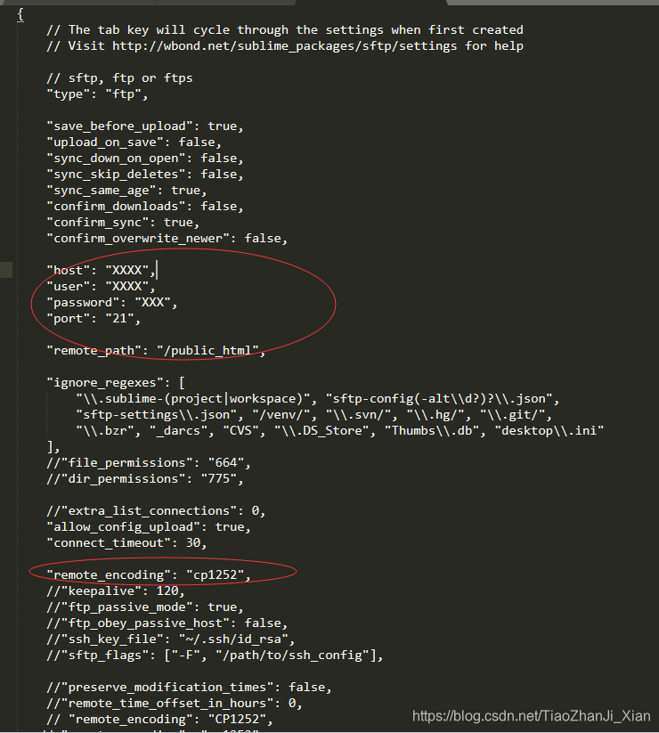 插件安装完成以后,需要进行配置。选菜单栏中的File->SFTP/FTP->Set up Server。这样就会打开一个配置文件:
