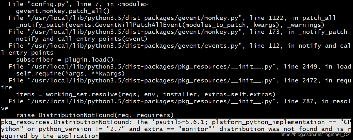 pkg_resources.DistributionNotFound: The 'psutil>=5.6.1; platform_python_implementation== "CPython" or python_version != "2.7" and extra =="monitor"' distribution was not found and is required by the application