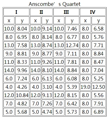 1973年,统计学家F.J. Anscombe构造出了四组奇特的数据。它告诉人们,在分析数据之前,描绘数据所对应的图像有多么的重要。这四组数据中,x值的平均数都是9.0,y值的平均数都是7.5;x值的方差都是10.0,y值的方差都是3.75;它们的相关度都是0.816,线性回归线都是y=3+0.5x。单从这些统计数字上看来,四组数据所反映出的实际情况非常相近,而事实上,这四组数据有着天壤之别。这四组数据如下所示: