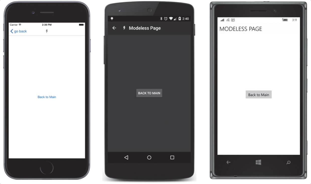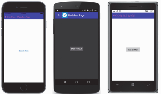 但是,在 本应用程序中无需此代码,因为 NavigationPage 类将导航栏添加到页面顶部,此页面包括平台相应的“返回”按钮,通过此按钮可返回上一页。