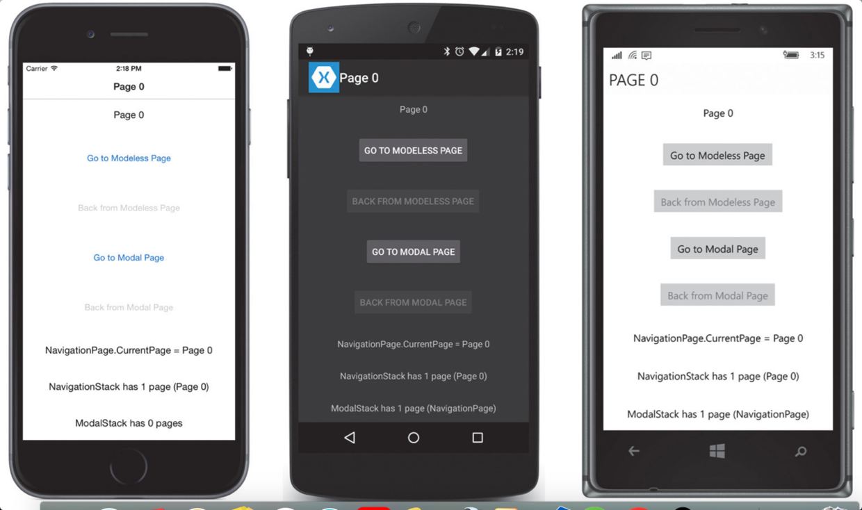 如果用MainPage = new NavigationPage(new Page0());初始化App的MainPage属性运行应用程序,此时IOS平台中ModalStack为空,Android和Windows平台ModalStack包含一个元素(MainPage对应
