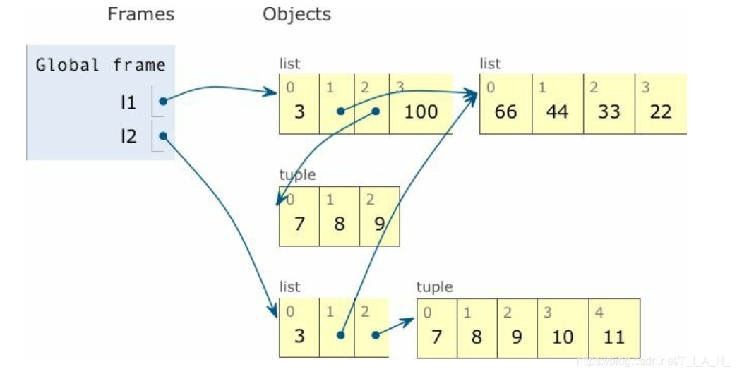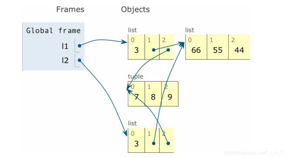 上图是执行 list2 = list(l1) 赋值后的程序状态。list1 和 list2指代不同的列表,但是二者引用同一个列表 [66, 55, 44] 和元组(7, 8, 9)