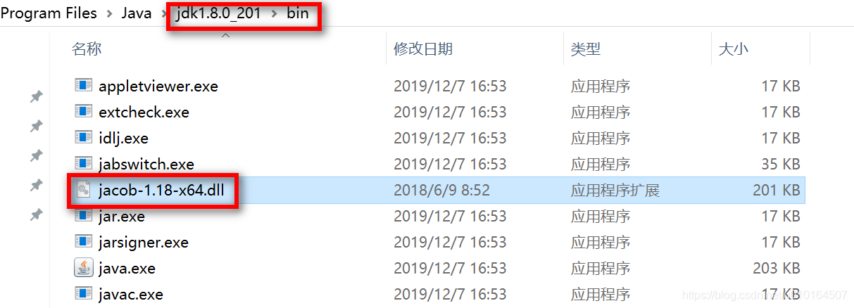 将jacob-1.1864.dll文件复制到当前使用JDK的bin目录下即可,如下图:
