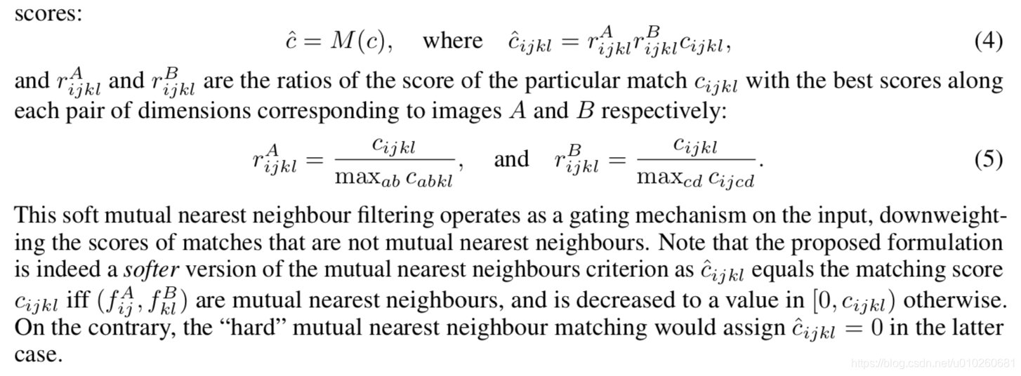 因为每个图像上都存在(x y)特征,因此Cijkl的每一层都表示图像A中的(i,j)和图像B中的每一个k,l的匹配score,因此可以使用raio 增大feature距离最近的匹配,抑制feature 距离相对教远的匹配