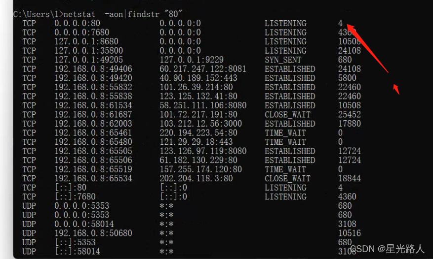 这里可以看到系统的80端口被进程id为4的进程占用了,接下来看看4的进程是什么