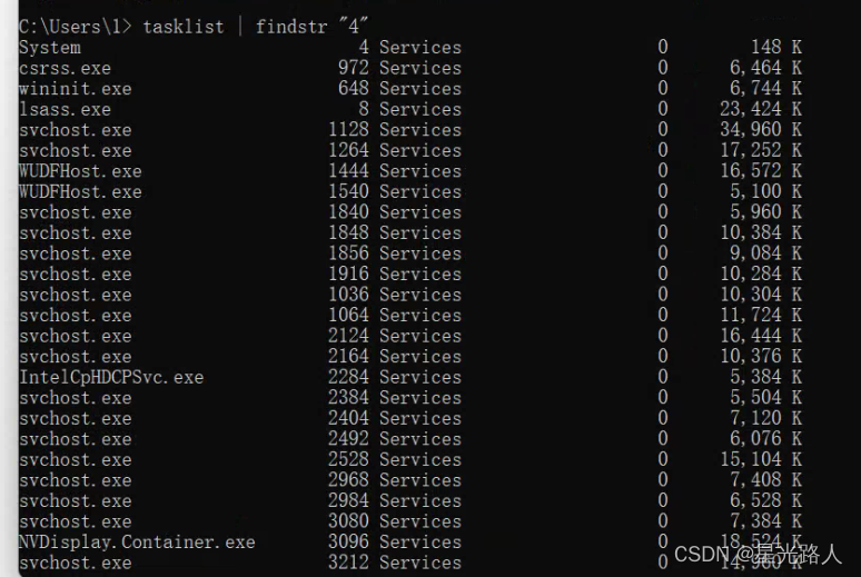 执行 tasklist | findstr "4" 命令,进程id需要根据自己的情况改为自己的实际进程id