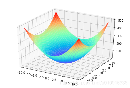 figure = plot.figure()#画出三维坐标系:axes = Axes3D(figure)X = np.arange(-10, 10, 0.25)Y = np.arange(-10, 10, 0.25)#限定图形的样式是网格线的样式:X, Y = np.meshgrid(X, Y)Z = 3*(X)**2 + 2*(Y)**2 + 5#绘制曲面,采用彩虹色着色:axes.plot_surface(X, Y, Z,cmap='rainbow')#图形可视化:plot.show()