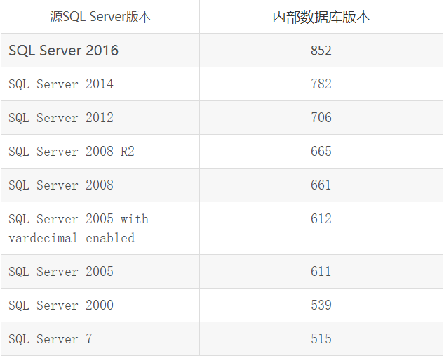 SQLServer版本对应内部数据库版本号配置表
