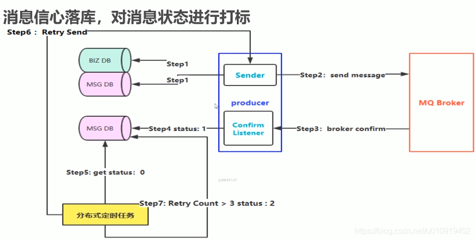 假设step2通过,在step3回送响应时,网络突然出现了闪断,导致生产端的Listener收不到这条消息的confirm应答,消息的状态始终为0 - step5:分布式定时任务抓取状态为0的消息