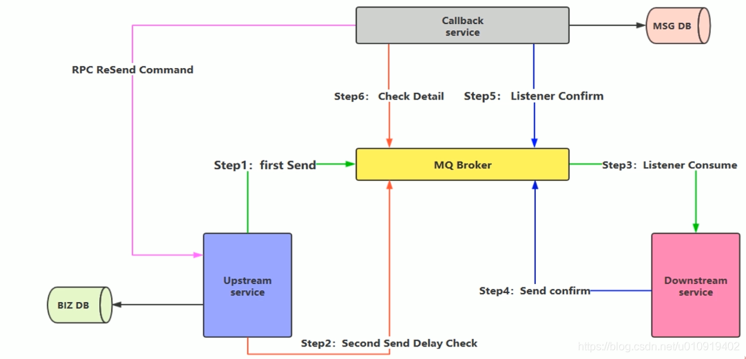 - step6 一定延迟时间之后再次发送消息给Broker,然后还是Callback Service去监听延迟消息所对应的队列.收到之后去检查MSG DB中是否有这条消息,如果存在,通过.不存在或者是消毒费失败了,那么Callback Service就需要主动发起RPC通信给上游服务,告诉它延迟投递的这条消息没有找到,需要重新发送,生产端收到信息后就会重新查询业务消息然后将消息发送出去,循环第一步。