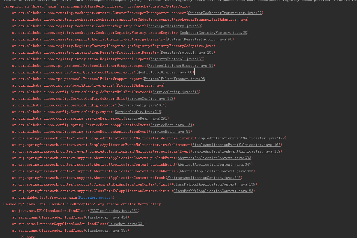本文主要是介绍dubbo-2.6.5解决 启动java.lang.NoClassDefFoundError: org/apache/curator/RetryPolicy 问题,希望对大家解决编程问题提供一定的参考价值,需要的开发者们随着小编来一起学习吧!