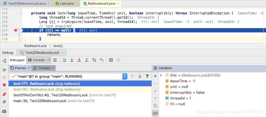 // test02TryWaitingLock(disLock);}// case1, no conflictpublic static void test01NoConflict(RLock disLock) {System.out.println(" before lock : " + new Date());disLock.lock();System.out.println(" after lock : " + new Date());System.out.println(" do biz ");disLock.unlock();System.out.println(" the end ");}// // case2. other thread hold the lock, then lockpublic static void test02TryWaitingLock(RLock disLock) {// first thread hold the lock 2 secondsnew Thread(() -> {disLock.lock();sleep(2000);disLock.unlock();}).start();sleep(10);System.out.println(" before lock : " + new Date());disLock.lock();System.out.println(" after lock : " + new Date());System.out.println(" do biz ");disLock.unlock();System.out.println(" the end ");}}