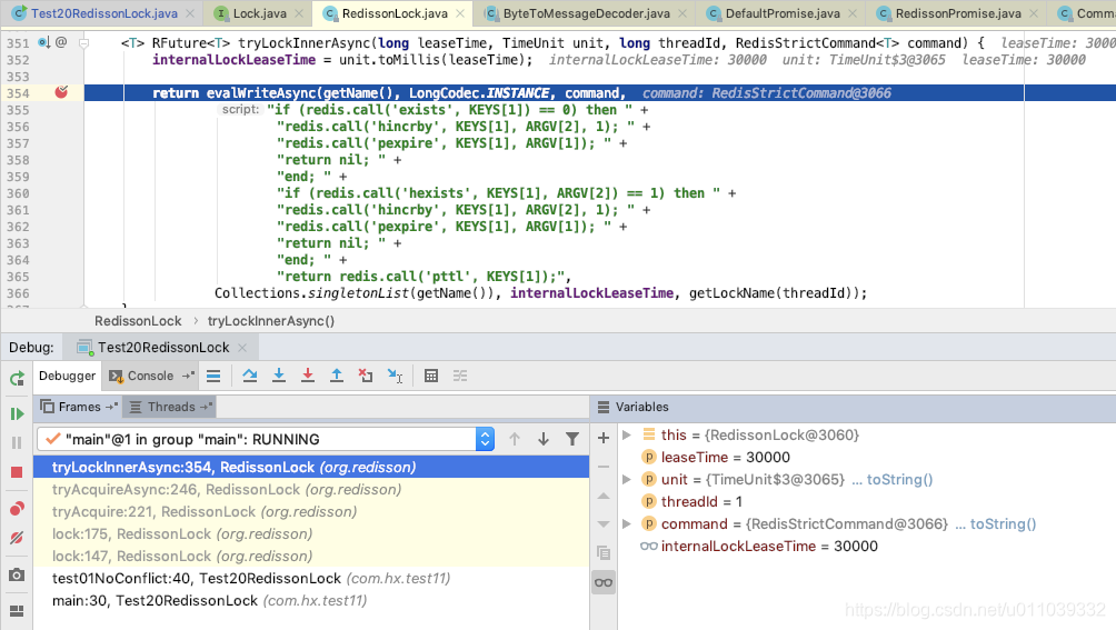 上面的 lock 相关 lua 代码来自于 RedissonLock 的如下代码片段, 传递 如下 script, keys, args 给 redis-server