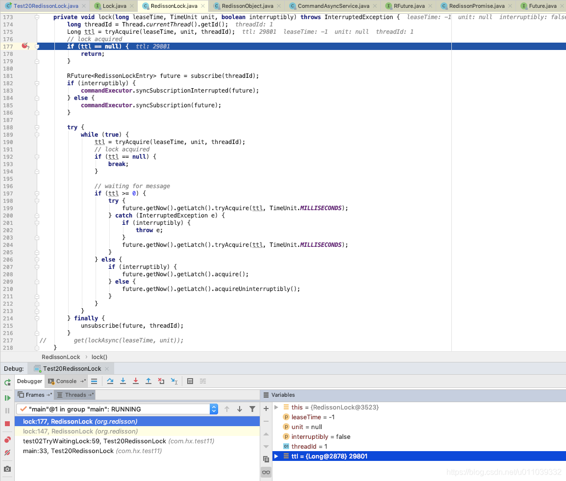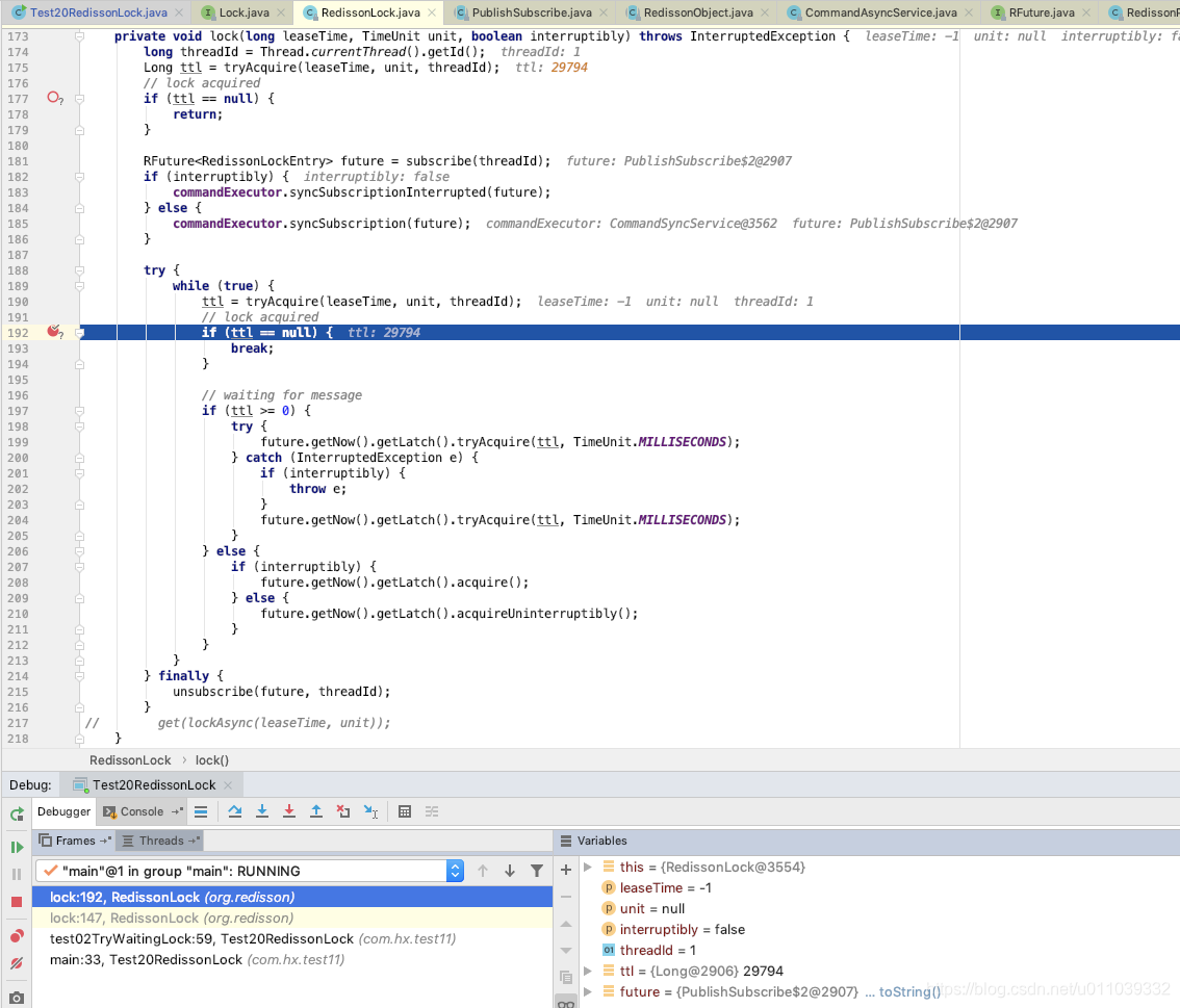 main 线程里面 再次尝试 tryAcquire, 拿到的 "sync" 的 ttl 是 29794, 可以看出 subscribe 这部分的注册是没有多大的开销的