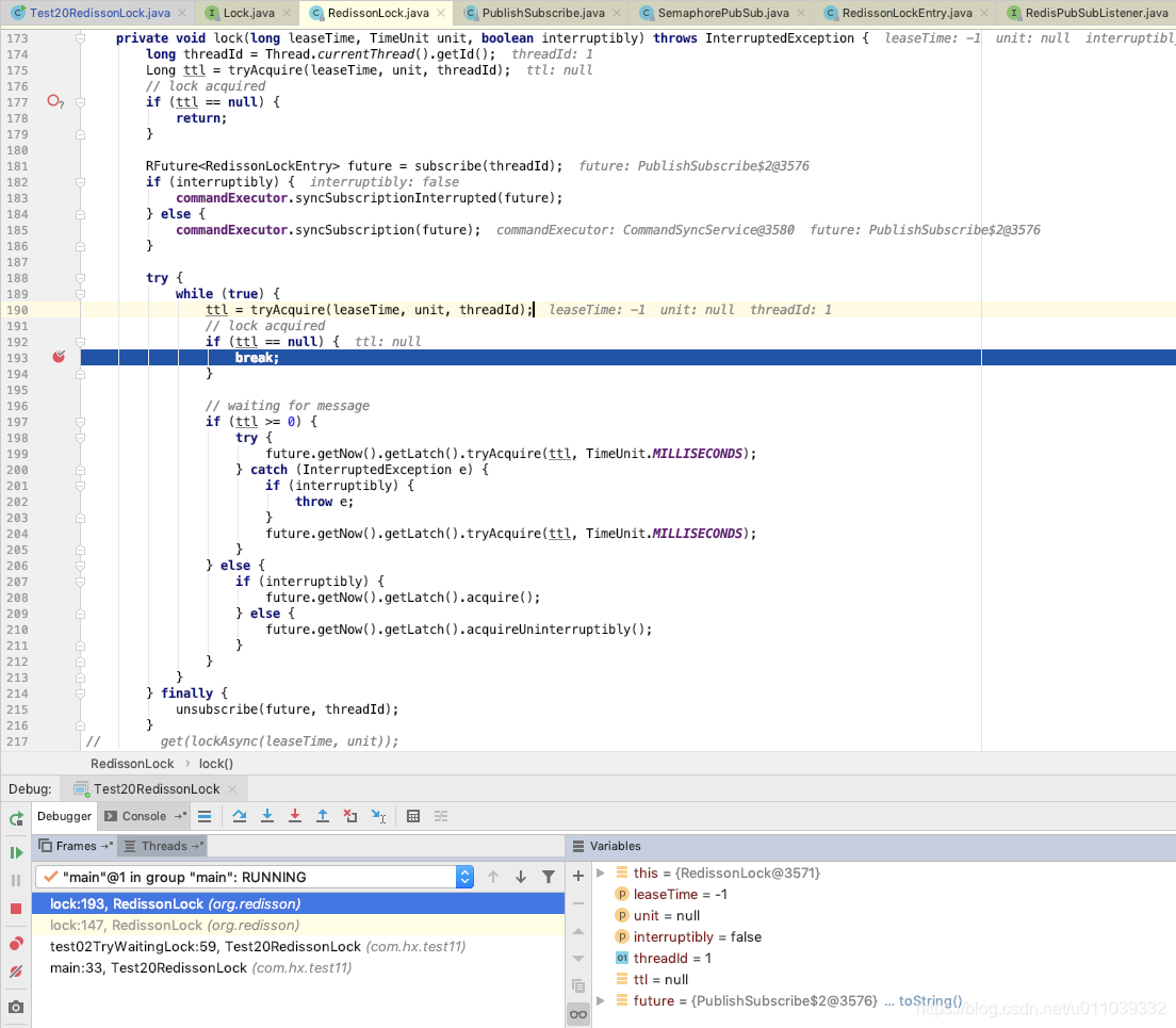 然后接着走下一个循环, 此时 线程1 已经 unlock 了 "sync" 的锁, main 线程再来第三次 tryAcquire 获取 "sync" 的锁成功, ttl 返回 null, 跳出循环