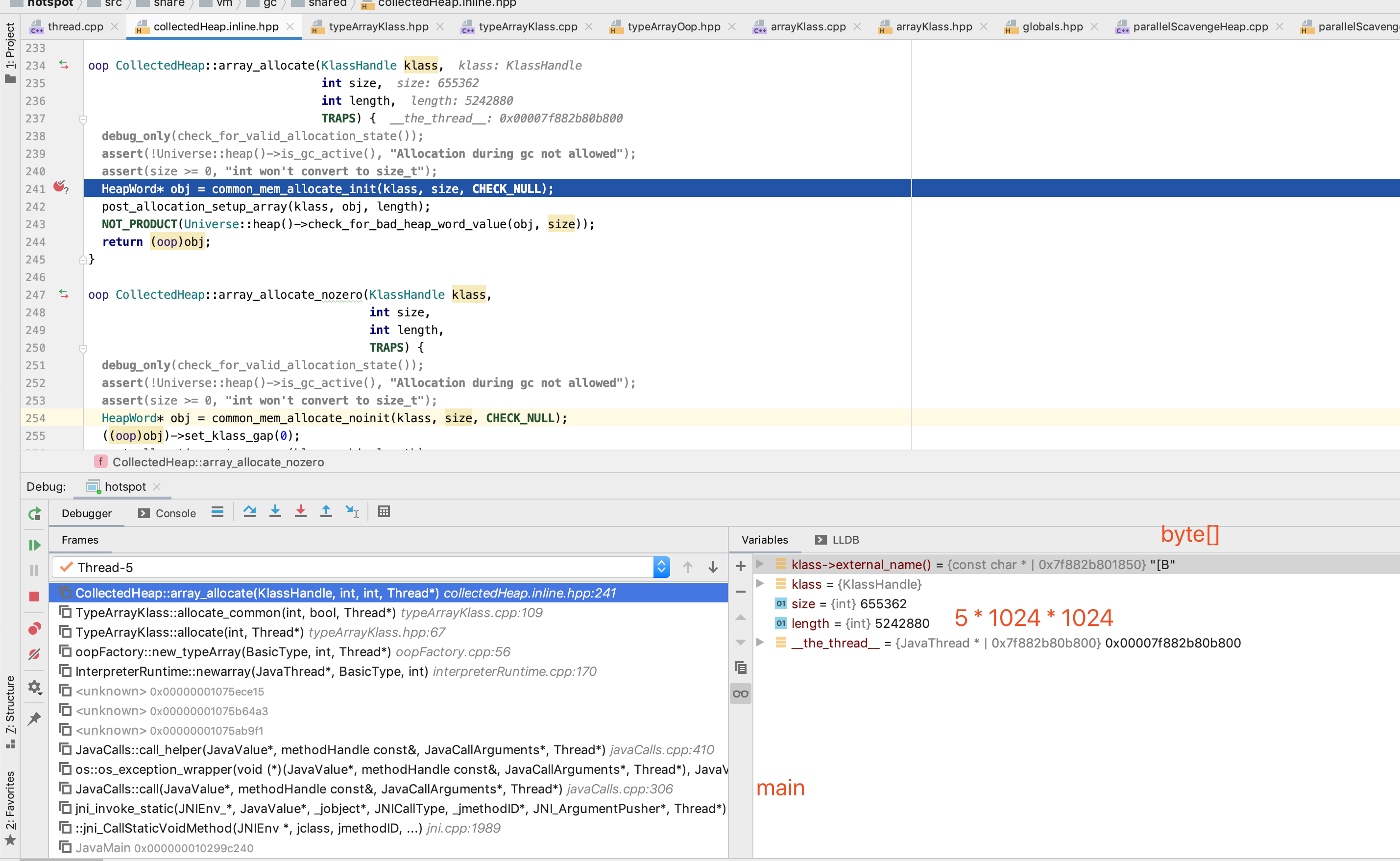 可以看到, 这里是 第一个 "new byte[_1MB*5]", length 为 5M, size 怎么看起来和 length 没什么关系啊 ?