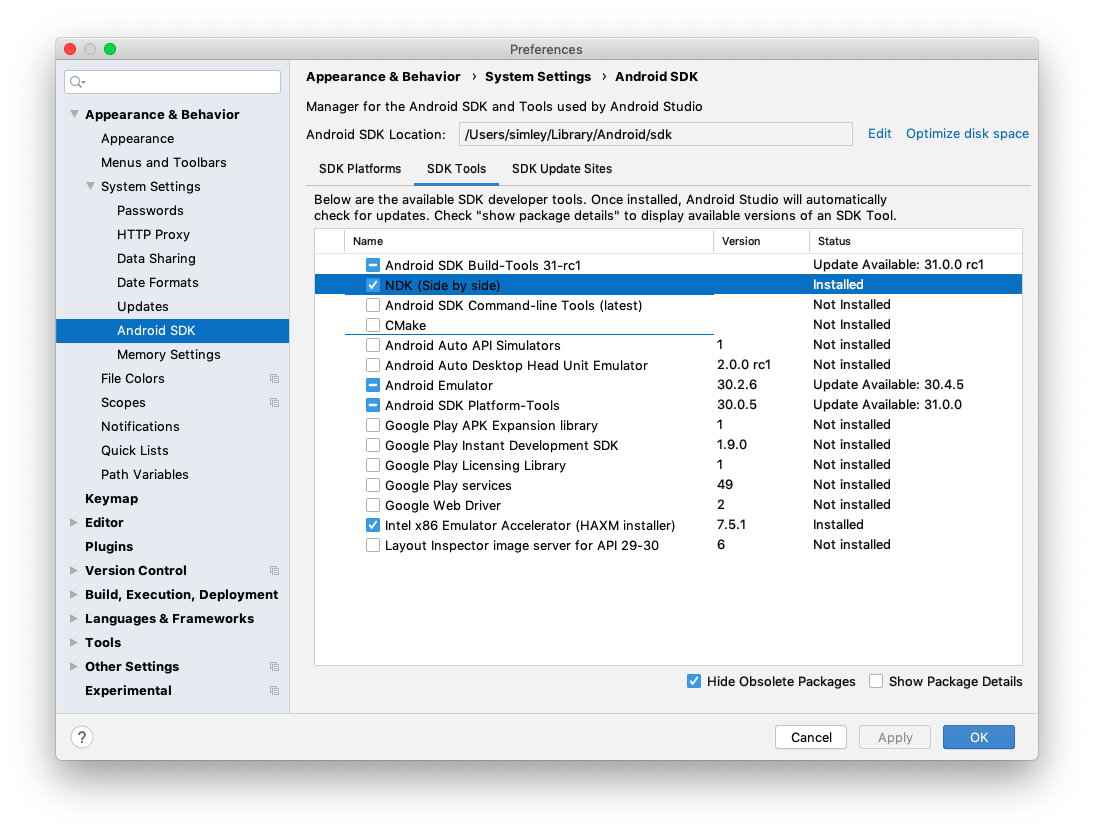 2. 点击右下角的Show Package Details展开所有的列表,然后在NDK(Side by Side)中选择你想要安装的NDK的版本