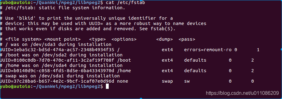 下面我们看看看/etc/fstab文件,这是我的linux环境中/etc/fstab文件中的内容