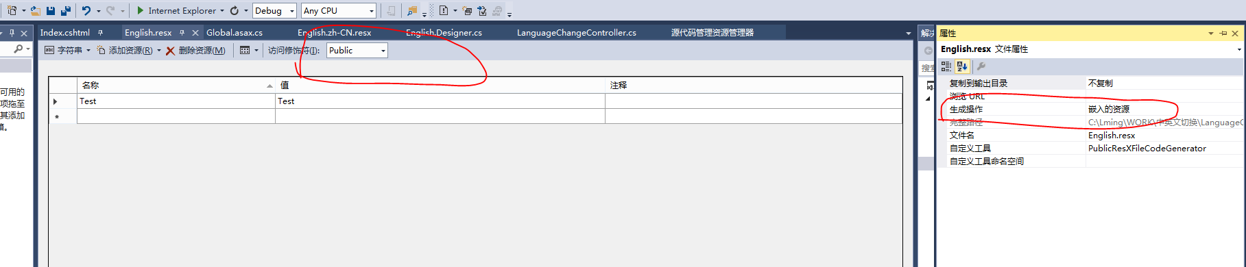 资源文件在创建时,默认属性"生成操作”为内容,在此情况下,程序在编译时,不会将此资源文件编译到程序当中去,修改为” 嵌入的资源“即可。注意:创建资源文件后,需将”访问修饰符“修改为”public“,否者无法访问(如果有多种语言,只需设置其中一个语言的资源文件即可)。