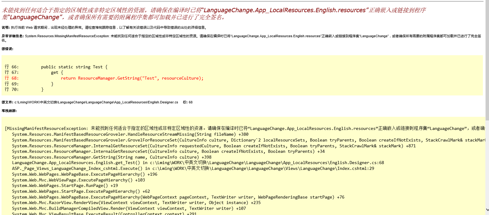 未能找到任何适合于指定的区域性或非特定区域性的资源。请确保在编译时已将“LanguageChange.App_LocalResources.English.resources”正确嵌入或链接到程序集“LanguageChange”,或者确保所有需要的附属程序集都可加载并已进行了完全签名。