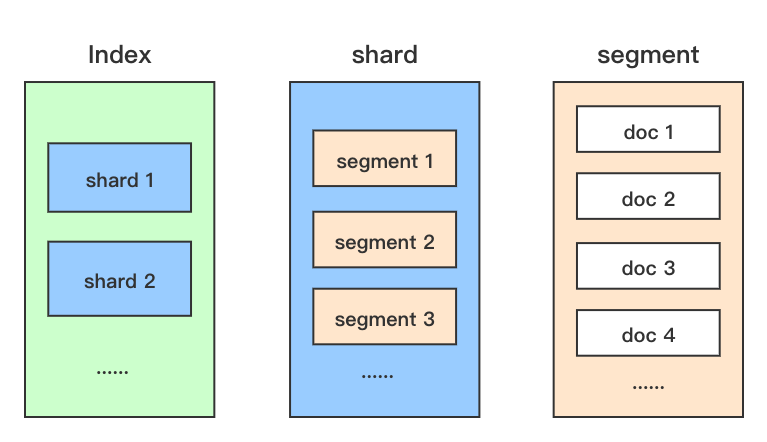 ES 的一个索引集群可能有多个分片,每个分片又是一个 Lucene Index,每一个 Lucene Index 由多个 Segment 构成(Segment可以理解为是Index的子集),每个 Segment 由多个Document 构成。